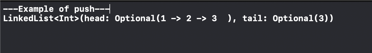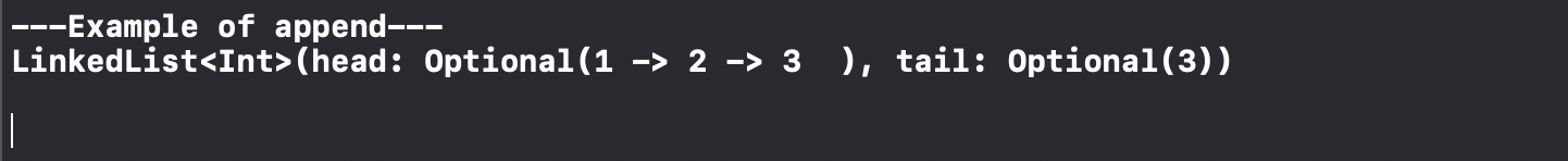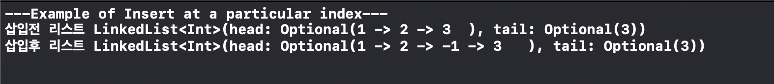example(of: "Insert at a particular index") { var list = LinkedList<Int>() list.push(3) list.push(2) list.push(1) // 1, 2, 3 인 연결리스트 print("삽입전 리스트 \(list)") list.insert(-1, after: list.node(at: 1)!) // 인덱스 1 번째 노드 (컴퓨터에선 2 번째) 뒤에 -1 삽입 print("삽입후 리스트 \(list)") }